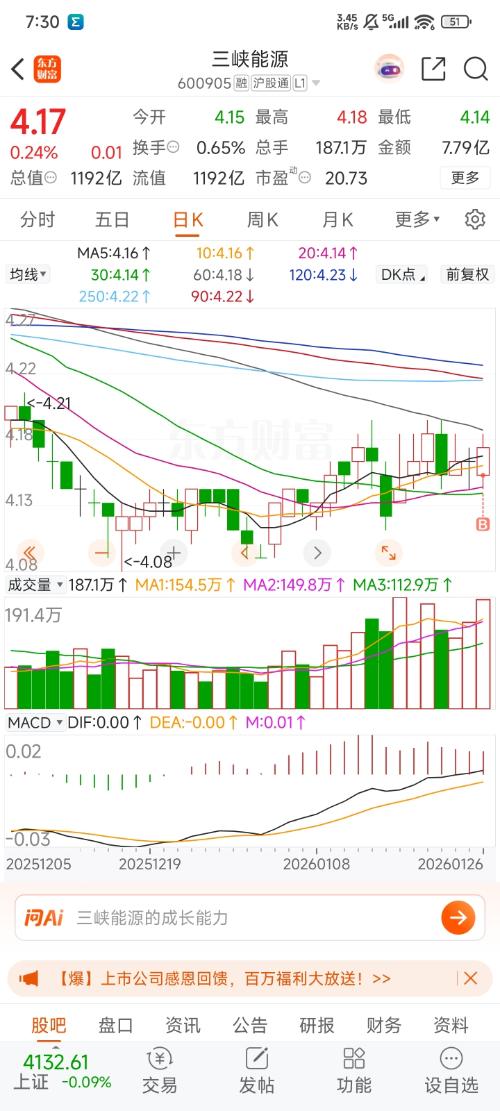 $三峡能源(SH600905)$三峡如果明天过十亿成交量,春节前过五元,缩量还得磨。