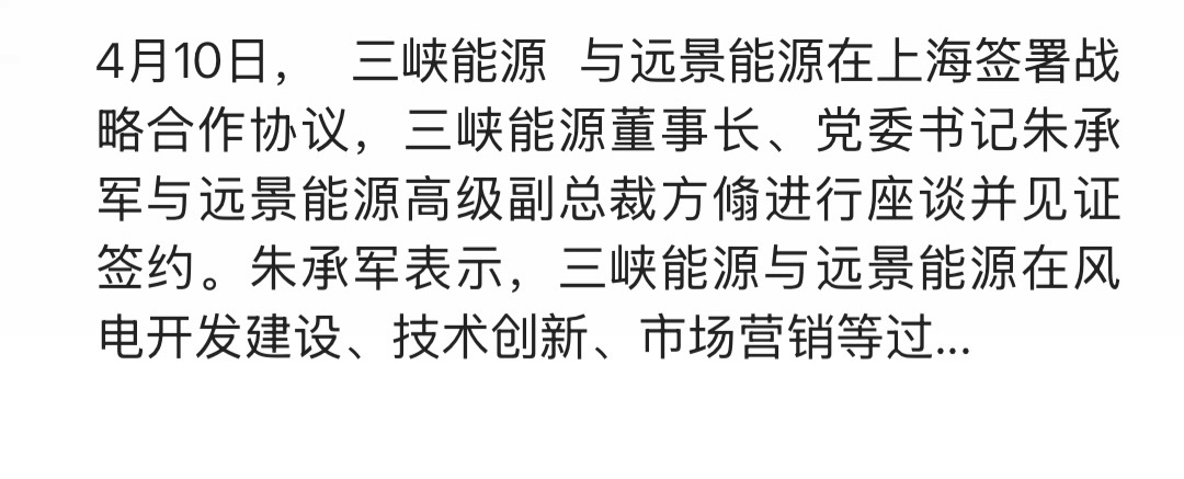 $三峡能源(SH600905)$4月10日,三峡能源与远景能源在上海签署战略合作协议,三峡能源董事长、党委书记朱承军与远景能源高级副总裁方翛进行座谈并见证签约。朱承军表示,三峡能源与远景能源在风电开发建设、技术创新、市场营销等过程中建立了良好的合作关系,希望双方秉持优势互补、合作共赢原则,加快推进海上风电、陆上大基地、非电利用、新型储能等重点领域的协同布局,共同助力构建清洁低碳安全高效的新型能源体...