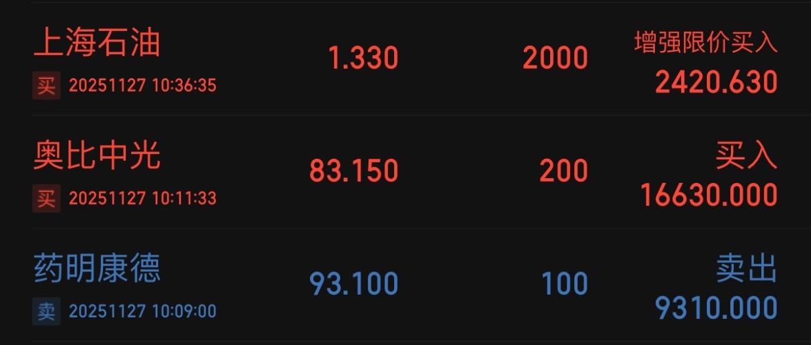 $中国海油(SH600938)$ 周中调仓已在特别贴中说明,本周其余调仓于11/27完成。 以83.15元买入奥比中光200股,目的为以其为切入口了解科技股,并平衡持仓,仓位2.8%。估值方面:合理区间,常规配置。 本周收盘总资产59.12w,总盈亏+23.12w,较上周-0.50w,跌幅-0.8%。 $中国海洋石油(HK|00883)$ $奥比中光-UW(SH688322)$