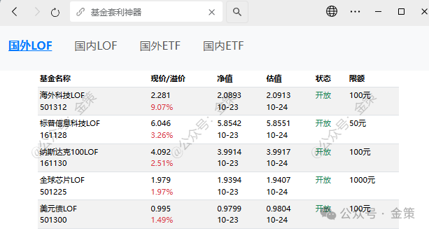 //基金套利// 海外科技LOF,现在溢价在高位持续保持,前段时间限购500,今天卖出一笔,净赚53,可惜现在是限购100了,不犹豫,直接发车。$标普信息科技LOF(SZ161128)$ 标普信息LOF,继续限购50元,6车就是300元,一点小钱也捡下吧。 油气类LOF溢价,溢价都被磨平了,不建议再发车了。 美元债LOF,持续机器人场外定投中。 **盘中实时溢价可参考套利神器:**必看!!最牛基金...
