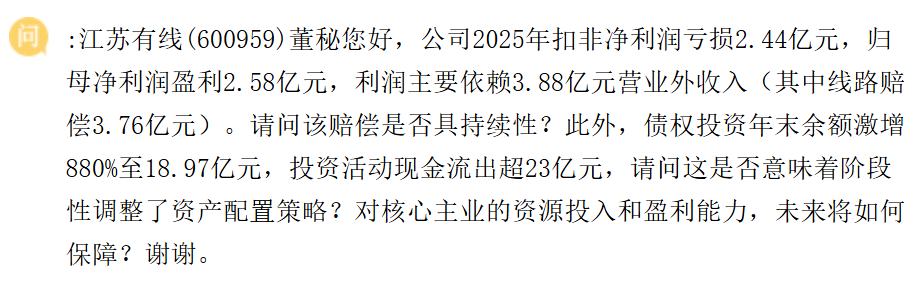 $江苏有线(SH600959)$e互动上看到有投资者就江苏有线年报提出几点疑问,转出来供大家参考。 2025年公司扣非净利润亏损2.44亿元,但归母净利润盈利2.58亿元,主要依赖3.88亿元营业外收入,其中线路赔偿达3.76亿元。 1.线路赔偿是否具有持续性? 利润核心来源是线路赔偿,但这类收入通常具有偶发性。如果未来赔偿金额减少或消失,公司如何填补利润缺口? 2.债权投资激增880%,是否意味...
