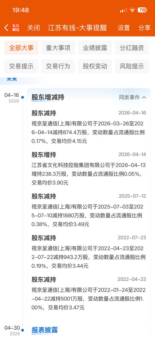 格隆汇4月15日丨江苏有线(600959.SH)公布,截至本公告披露日,视京呈通信通过集中竞价交易方式,减持874.44万股,仍持有公司525.57万股无限售条件流通股,占公司总股本比例为0.11%。