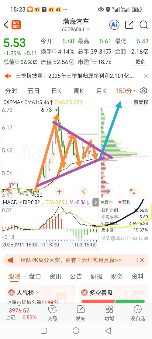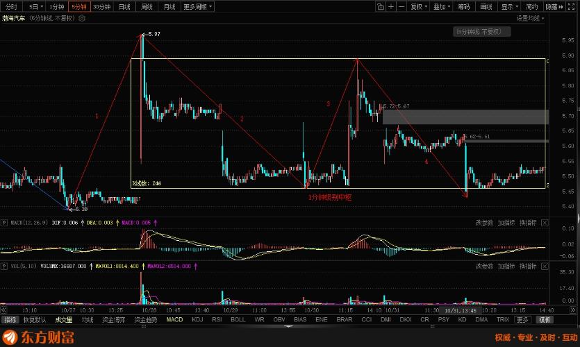 $渤海汽车(SH600960)$ 30分钟回调一笔不破前高,5分钟级别中枢上方,三买确立。当前位置构建1分钟级别中枢。