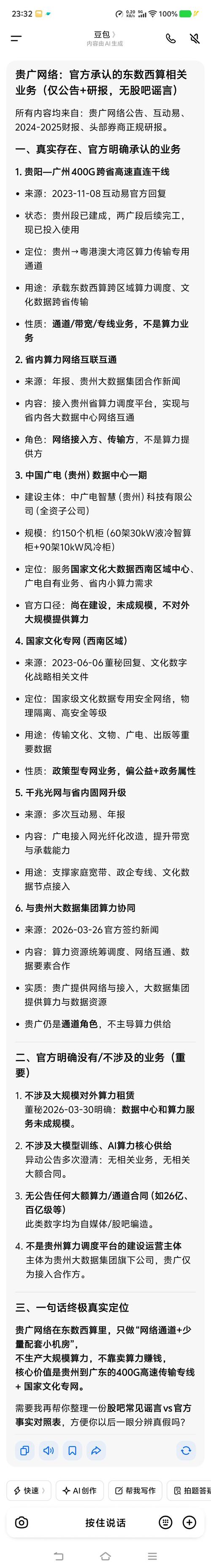 $贵广网络(SH600996)$贵广网络“无算力业务”公告VS事实证据对照 一、公司公告原文(核心误导点) 1.2026-03-30股票交易异常波动公告 “经核查,截至目前,公司不涉及算力相关业务,公司主营业务未发生重大变化。” 2.2026-03-31互动易平台回复 “公司目前不涉及算力相关业务,不存在应披露而未披露信息。” 结论:公司使用全称否定,对外传递“完全没有算力业务”的明确信号。 二、...
