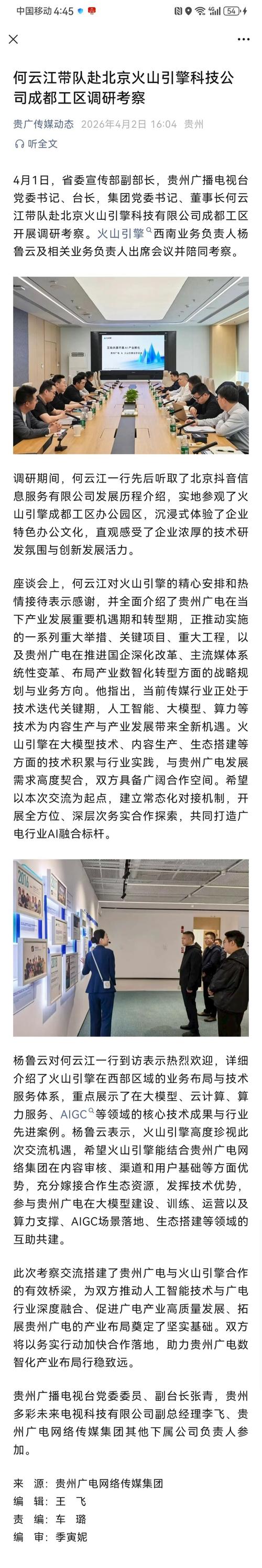 $贵广网络(SH600996)$$奥瑞德(SH600666)$$美利云(SZ000815)$ 这是非常明确的实质性利好,且是“订单落地级”的利好,而非单纯的题材炒作。 此次贵州广电(贵广网络控股股东)与火山引擎的高层会晤,直接打通了贵广网络算力业务的需求端与技术端,具体利好逻辑如下: 1.核心利好:合作直接升级为“战略级” •现有合作基础(实打实的收入):贵广网络的全资子公司贵广数据目前已是火山引...