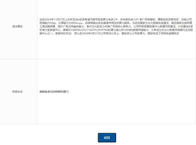 【问】请问董秘2023年11月27日,您在互动E回答投资者问题说当前公司存储能力为6p,计算能力20000vcpu,后续根据业务发展提供相应的算力服务。您又再2026年3月31日异动公告说公司不涉及算力相关业务,请问这不相互矛盾吗?【答】贵广网络:尊敬的投资者您好,公司未对外开展算力相关业务。公司业务布局与规划将严格按照监管要求履行信息披露义务,相关信息请以公司公告为准,敬请广大投资者谨慎对待其他渠道信息,理性投资,注意防范市场和投资风险。感谢您的关注!