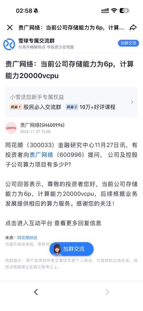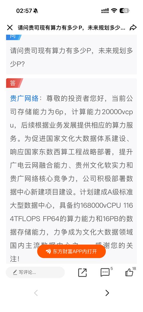 $贵广网络(SH600996)$$奥瑞德(SH600666)$$美利云(SZ000815)$ 这是贵广网络2023年11月在上证e互动的官方回复,是算力业务的铁证,我们把它的算力规模拆解得明明白白: 一、当前算力规模(已落地) 1.存储能力:6P(即6PB,1PB=1024TB,约6144TB) 2.计算能力:20000vCPU(虚拟CPU核心) 这个规模在当时已经属于具备一定基础的算力资源,而且...