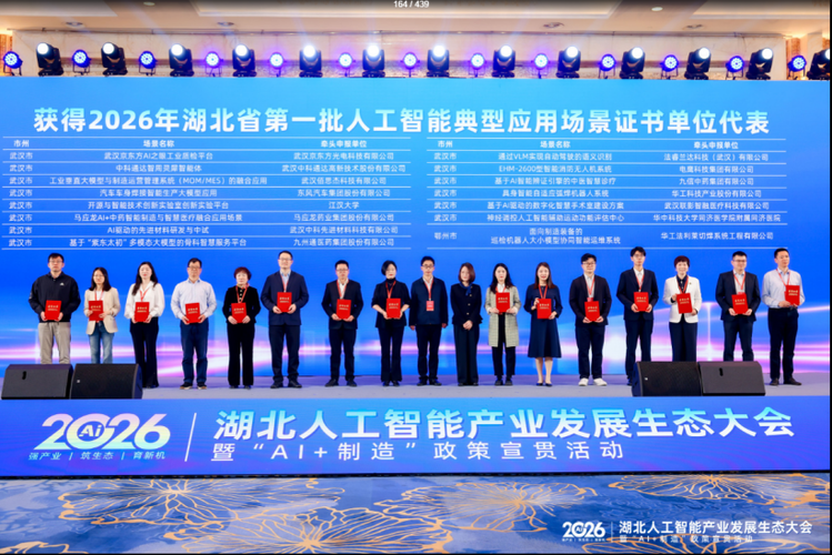 4月16日,2026湖北人工智能产业发展生态大会暨“AI+制造”政策宣贯活动成功举办。本次大会由湖北省经济和信息化厅、湖北省发展和改革委员会指导,湖北省软件行业协会主办,现场发布“2026年湖北省人工智能典型应用场景名单”,九州通“基于‘紫东太初’多模态大模型的骨科智慧服务平台”、九信中药“基于AI智能辨证引擎的中医智慧诊疗”等项目成功入选,标志着公司在数智化领域再度获得权威认证。 大会以“强产业...