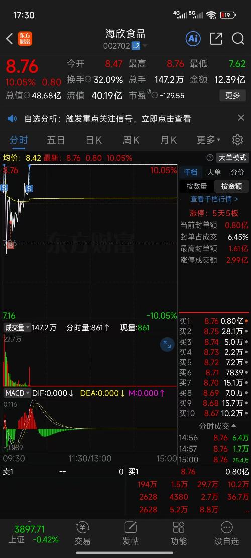 今天操作之“海欣食品”:2次涨停板上T出1/3仓位,成本降到3.65元,明天看好海欣食品继续连板,今年的食品妖股就是他了!补充:T出的仓位买入“金陵饭店”,看好他成为第二个“西安饮食”!$海欣食品(SZ002702)$$金陵饭店(SH601007)$$惠发食品(SH603536)$ $