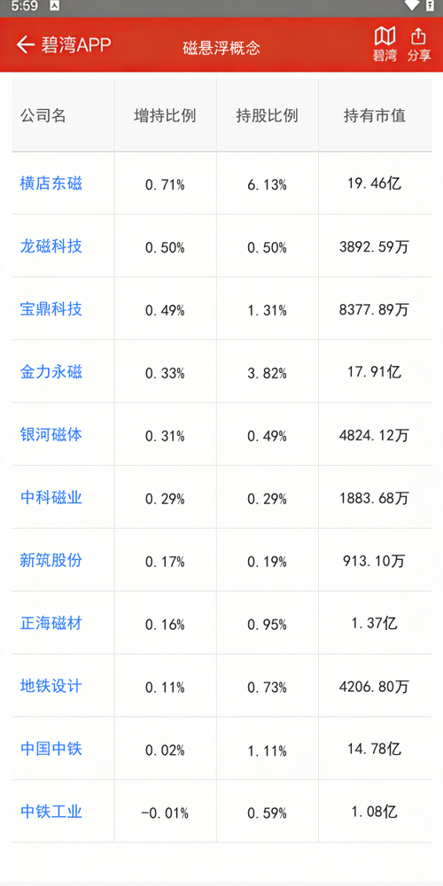 刚在碧湾APP上瞄了眼北向资金流向,发现磁悬浮这波有点意思啊!横店东磁被外资加仓0.71%,现在持股6.13%,市值都干到19亿多了;金力永磁也涨了0.33%,持股市值快18亿。龙磁、宝鼎、银河磁体也都小幅增持,虽然比例不大,但清一色都在买。说实话,外资这阵子动作挺一致的,虽说不能盲跟,但人家真金白银进场,至少说明短期没看空吧?咱们小散多少可以多留个心眼。