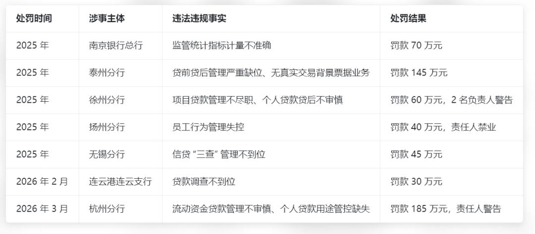 作为国内头部城商行与系统重要性银行,南京银行(601009.SH)近年资产规模快速突破3万亿元,2025年营收、净利润双双实现双位数增长,业绩表现亮眼。 但光鲜数据背后,2025年至今合规风险持续集中爆发、罚单密集落地,叠加资产质量承压、资本充足率下滑、子公司消金业务乱象频发,多重风险交织下,其“重规模、轻风控”的发展模式正遭遇严峻考验,长期稳健根基面临侵蚀。 2025年至今罚单频发,合规问题全面...