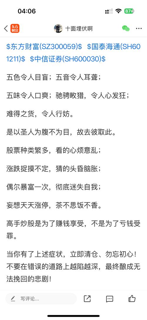 $隆基绿能(SH601012)$$中国卫通(SH601698)$$卧龙电驱(SH600580)$ 《老子教我炒股》第十三章 宠辱若惊,贵大患若身。 何谓宠辱若惊? 宠为下,得之若惊,失之若惊,是谓宠辱若惊。 何谓贵大患若身? 吾所以有大患者,为吾有身, 及吾无身,吾有何患? 故贵以身为天下,若可寄天下; 爱以身为天下,若可托天下。 赚钱,惊喜、膨胀;亏钱,恐慌、迷失。 惊恐是因为执迷于物质的得失。...