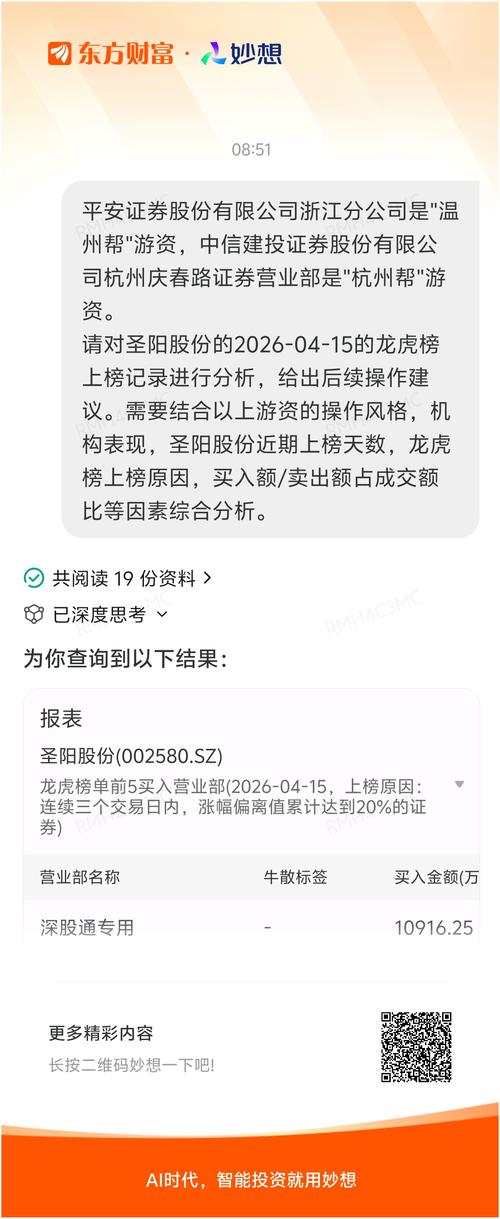 #@妙想,你怎么看?#妙想一下:平安证券股份有限公司浙江分公司是"温州帮"游资,中信建投证券股份有限公司杭州庆春路证券营业部是"杭州帮"游资。 请对圣阳股份的2026-04-15的龙虎榜上榜记录进行分析,给出后续操作建议。需要结合以上游资的操作风格,机构表现,圣阳股份近期上榜天数,龙虎榜上榜原因,买入额/卖出额占成交额比等因素综合分析。