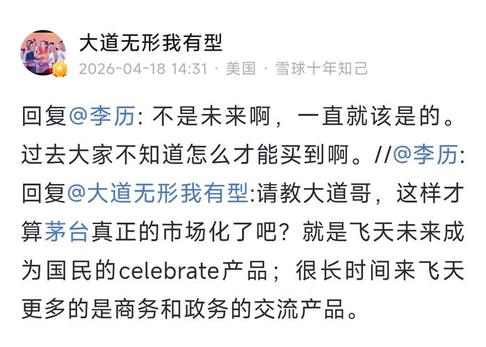 网友:请教大道哥,这样才算茅台真正的市场化了吧?就是飞天未来成为国民的celebrate产品;很长时间来飞天更多的是商务和政务的交流产品。 大道:不是未来啊,一直就该是的。过去大家不知道怎么才能买到啊。 #周末杂谈##炒股日记##复盘记录##强势机会#...