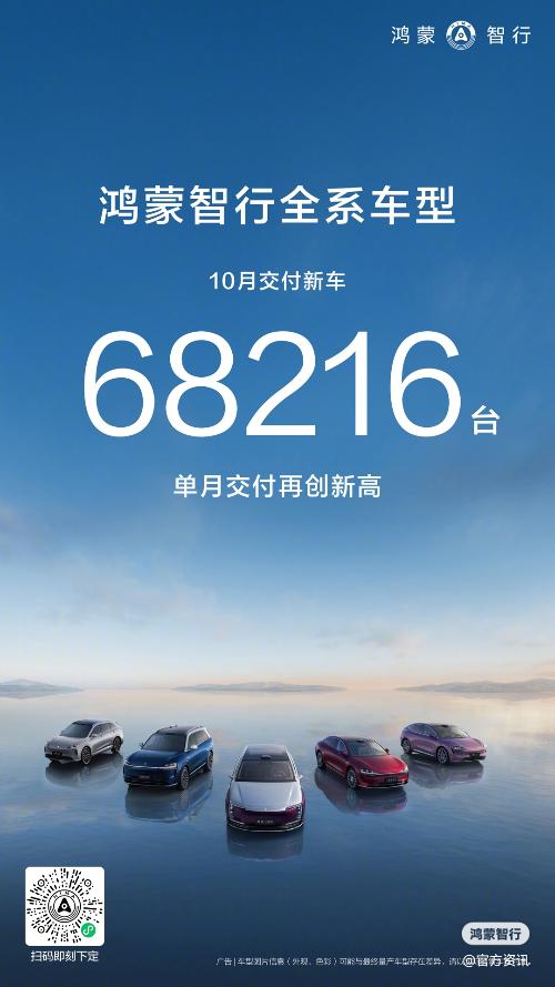 资讯 鸿蒙智行:10月交付新车68216台 创单月交付量历史新高