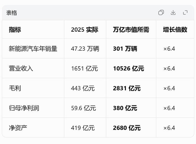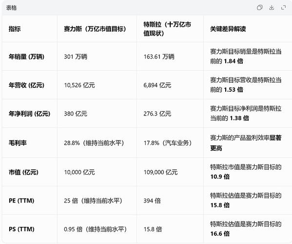 特斯拉总市值是赛力斯的70倍,先看特斯拉和赛力斯的经营数据和估值水平对照表: 若按特斯拉的估值水平,赛力斯当前的合理市值应该要超万亿水平。 若保持当前估值水平不变,赛力斯市值过万亿,需达到以下经营目标: 把赛力斯的万亿市值经营目标和特斯拉的十万亿市值经营现状数据对比列表 太炸烈了,赛力斯按当前估值水平想要达到万亿市值的经营目标,销量、营收、净利目标均超了当前十万亿市值的特斯拉。 所以赛力斯市值下滑...