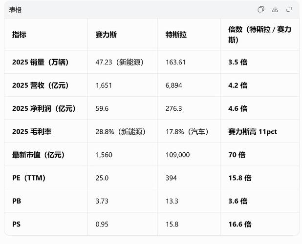 特斯拉和赛力斯的经营数据和估值水平对照表