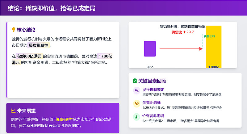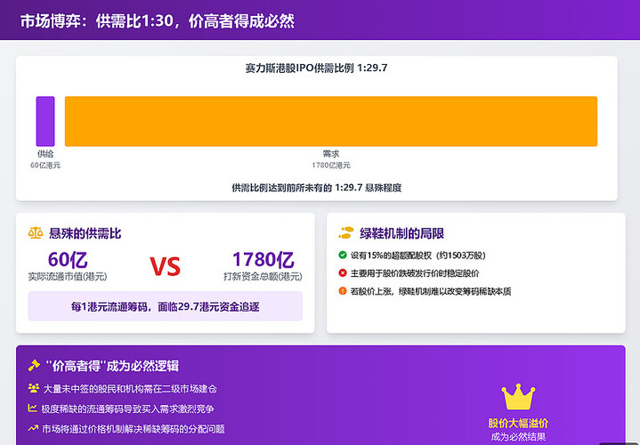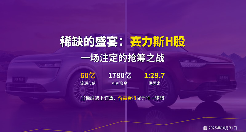 知士问答 更新于 今天 04:16 1448次浏览 稀缺盛宴:赛力斯H股,一场注定的抢筹之战 还是要以这张图来开头,“不及预期”的鸡蛙虫鼠们,你们下周连赛力斯的尾灯都看不到。 赛力斯港股上市后,股价会迅速飙升,AH价差将会快速缩小。待筹码集中后,H股价格一定会超过A股。以下是推理过程,逻辑若有误,请留言评论。 赛力斯港股上市后暴涨是一场由制度性稀缺与主动性惜售共同导演的资本盛宴。其传导逻辑不仅在于打新资金的疯狂围猎,更在于本已稀少的流通筹码,还被长线资金视为珍宝而收藏,导致市面筹码濒临“枯... 420