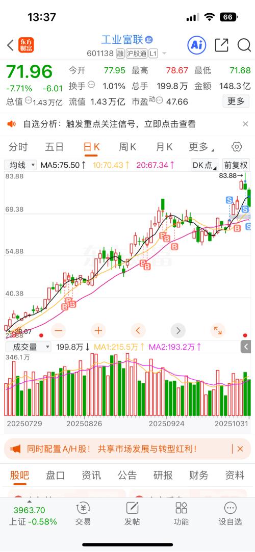 SalanZ 更新于 今天 14:15 9055次浏览 $工业富联(SH601138)$对于富联接下来走势的看法、 我前晚发的一份基于富联、三季度业绩报表的分析贴、我在这份帖也表明、富联的三季度业绩报属于超预期、但我前晚同时也提醒各位吧友、昨天富联必定会遭遇大量的短线资金获利盘抛压、如果大涨也要保持平常心、观察接下来两个交易日的股价走势、先沉淀下来、再规划接下来的操作、 其实富联昨天开盘后、涨幅几个点的表现、是基本符合出色三季度业绩报的预期、就像我前晚... 197107