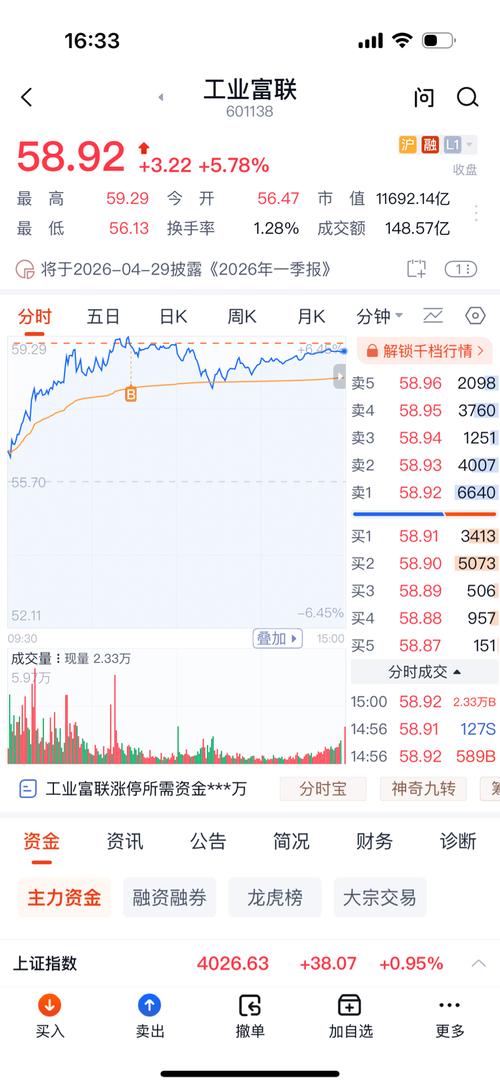 $工业富联(SH601138)$ 工业富联今放量大涨以中阳线报收,收盘距离60的目标还有一丢丢的距离,所以今天还是继续格局不动。它的走势中规中矩,因为流通盘很大,所以背后的大玩家都是机G为主。从基本面来看,它是全球领先的云计算和通信网络设备制造商,AI算力与智能终端双轮驱动的领军企业,25年的年报业绩同比增长51%;并且公司计划回购不超过5000万股用于注销,已经回购了1410万股,均价是35元附...