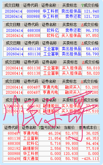 $工业富联(SH601138)$:今日果然大阳,但120线强阻力近在咫尺,按计划隔日T出昨日加仓的50%; $华工科技(SZ000988)$:4月3日介入后连涨6天,今日放量孕线下跌,不得已止盈了。 $亨通光电(SH600487)$:年内光纤涨价几倍了。连续调整多日,今日明显缩量,随时可能止跌回升; 融捷股份:锂矿自给率100%;欧科亿:一季度业绩暴增22倍以上,低卖高买不放弃。