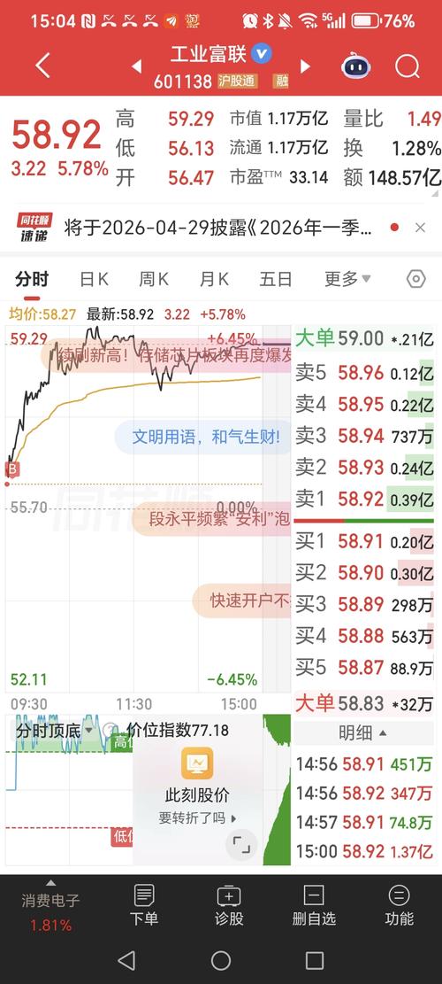 工业富联,虽说昨日并未出现上涨,收出缩量十字星,但这也就意味只要量能保持稳定,在短中期均线多头上移支撑下,继续走出时间换空间的概率也就会偏大。 昨天相信在看到科技强势上攻时,工业富联没给涨,心理肯定不是滋味,甚至会抱怨连天。结果,今天科技人工智能在外围继续大涨刺激下,再次强势回归,龙头板块存储芯片更是带领板块出现明显大涨。如此今天科技再次给到市场带来活跃性。 而作为行业的重要龙头,工业富联也并没有...