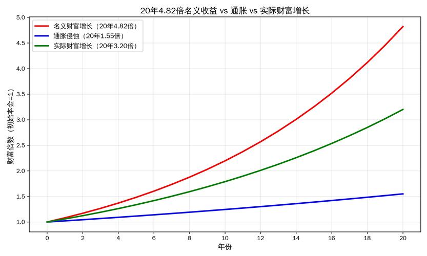 $兴业银行(SH601166)$ 一、兴业银行近20年收益率。 后复权后,近20年总增长4.825倍,年均收益率为8.18%。 二、我国近20年年均通胀率。 根据国家统计局公布的CPI数据,我国近20年(2005-2024年)的年均通货膨胀率约为2.2%。 三、三组数据对比图。 红色:兴业银行→20年到4.82倍。 蓝色:通胀侵蚀→20年到1.55倍。 绿色:实际财富→20年到3.20倍 四、对比...