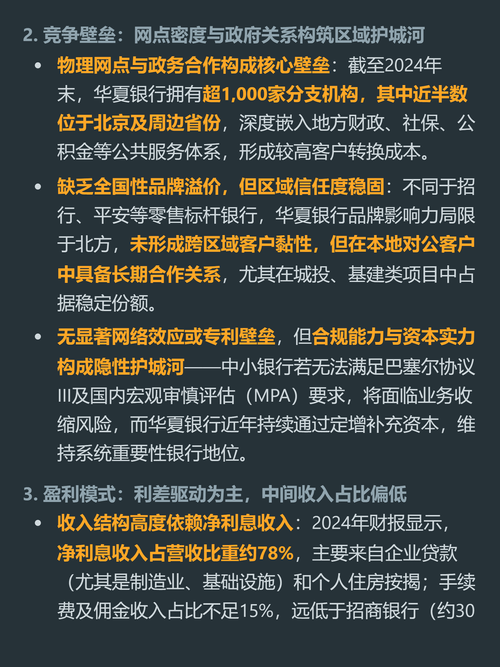 $华夏银行(SH600015)$$招商银行(SH600036)$$兴业银行(SH601166)$你以为银行拼的都是金融科技和服务创新?华夏银行的核心护城河,是别人根本抄不走的本地资源。 60%以上的存贷款集中在华北地区,近一半网点布局在北京及周边,深度绑定地方财政、社保、公积金系统,京津冀协同、雄安新区的对公项目基本都有它的份额,本地对公客户转换成本极高。 它的缺点也非常直白。78%的营收靠净利息...