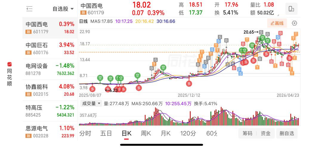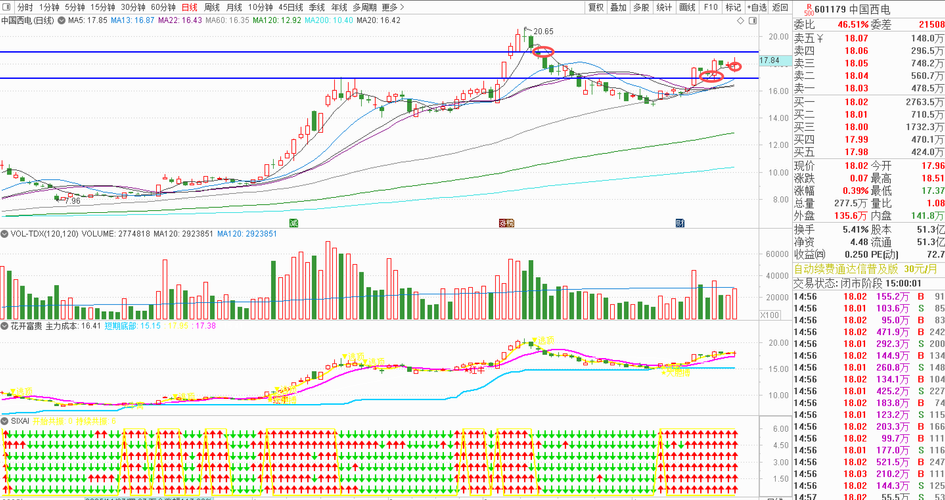 下午以17.58的价格介入西电,今日中国西电收涨0.39%,报18.02元,换手率5.41%,成交额50.02亿,分时图呈现“早盘冲高、午...