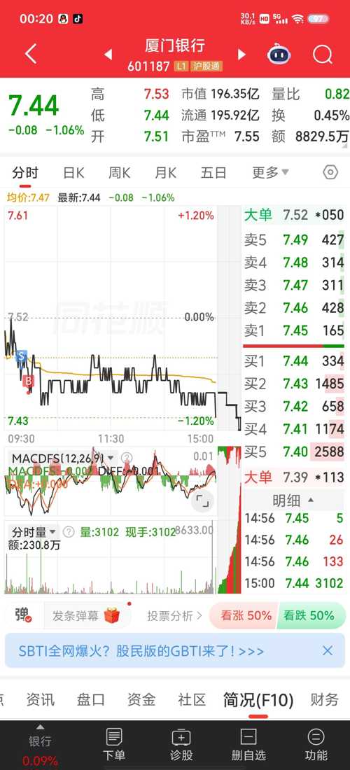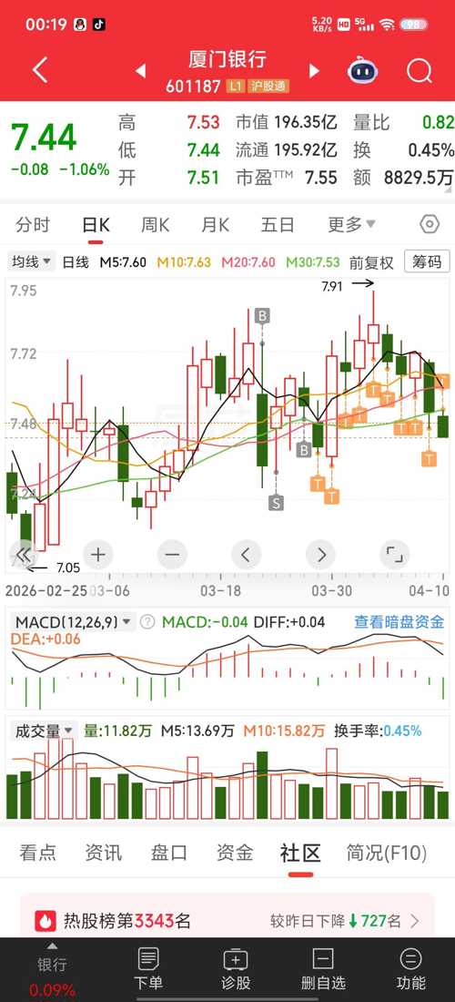 $厦门银行(SH601187)$周五7.45买了五成仓,7.46跑了,幸亏在水下没割