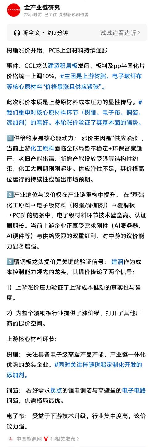 $东材科技(SH601208)$ $生益科技(SH600183)$ $建滔集团(HK|00148)$ 东材科技自8元底部大涨300%,当前股价33.5元、市值340亿元。公司手握国内唯一量产的M9级高频碳氢树脂,对标全球龙头日本JX,借英伟达核心板材供应商台光电切入GB200服务器、1.6T高速交换机产业链,深度绑定AI算力生态,下游应用领域:PCB是高增长核心赛道,但整体是电子+新能源+光学+电...