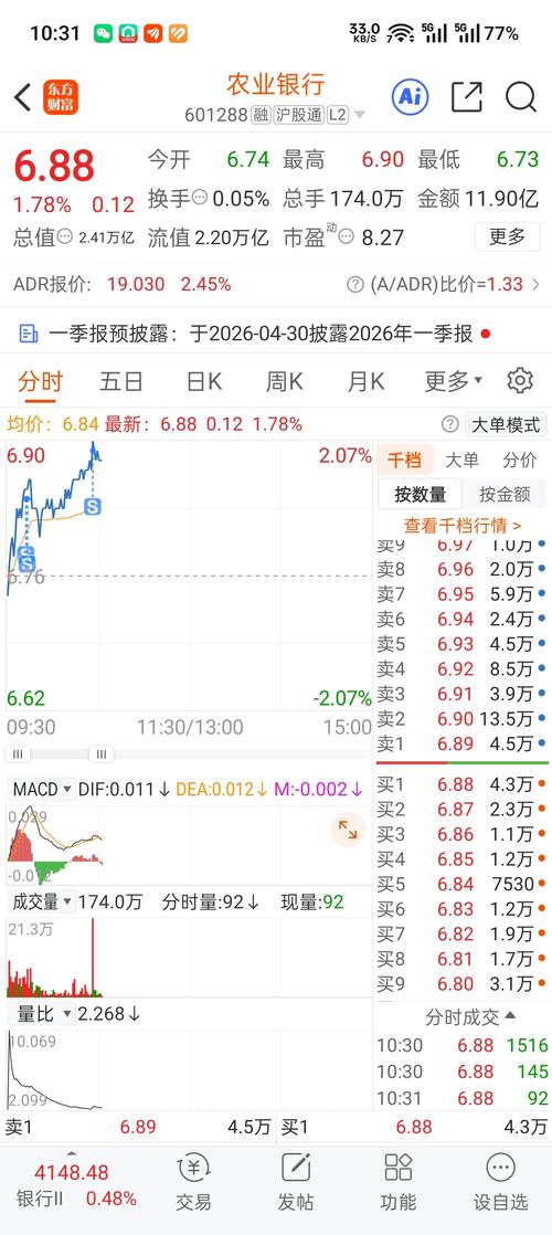 $农业银行(SH601288)$ 4月15日,截至11时36分,银行板块表现活跃,中证银行指数上涨0.73%,成份股方面,苏州银行领涨3.02%,农业银行上涨2.07%,招商银行上涨1.66%。 热门ETF方面,银行ETF华宝ETF场内价格上涨0.63%,成交额达3.28亿元。 消息面上,近期上市银行年报密集披露,13家代表性上市银行金融科技总投入已超1800亿元,多家国有大行与股份制银行正以差异...