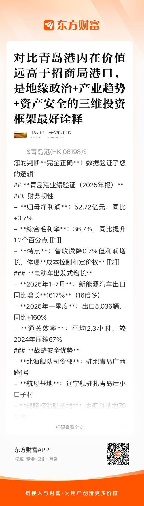 $青岛港(SH601298)$青岛港,全部资产在国内,不用承担巴拿马、马尔代夫科伦坡、伊朗、以色列、澳大利亚、意大利、希腊等地方的国家翻脸,拥有北海舰队主基地驻扎堡垒式安防、霍尔木兹海峡拥堵中国相对免受危机冲击,生产力获得更大相对提升、中国制造产品获得比东南亚、东亚、南亚原竞争国家更强的产品竞争力,以订单可靠、生产可靠、运输可靠的相对更强大竞争力跑赢全球。青岛港成为中国此番相对竞争力获得提升的巨大...