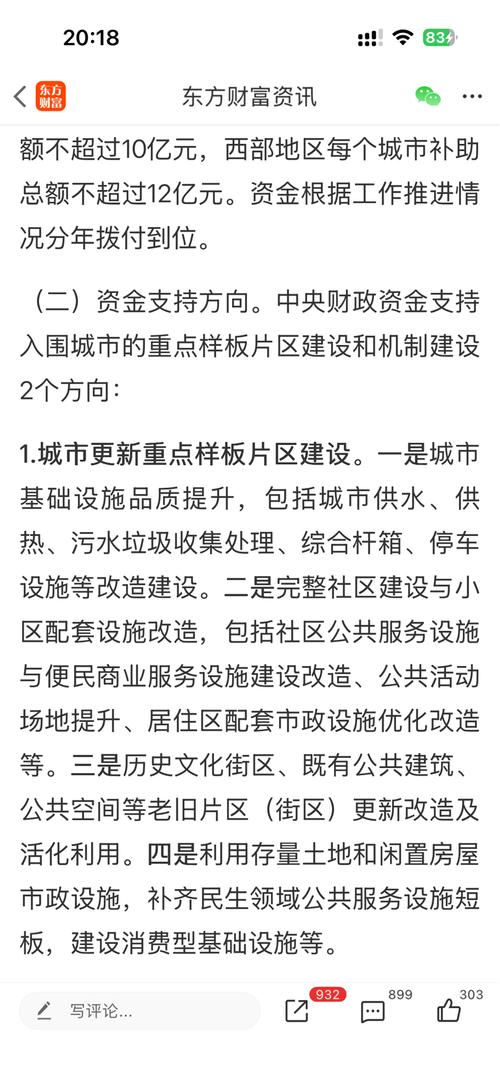 二)资金支持方向。中央财政资金支持入围城市的重点样板片区建设和机制建设2个方向: 1.城市更新重点样板片区建设。一是城市基础设施品质提升,包括城市供水、供热、污水垃圾收集处理、综合杆箱、停车设施等改造建设。二是完整社区建设与小区配套设施改造,包括社区公共服务设施与便民商业服务设施建设改造、公共活动场地提升、居住区配套市政设施优化改造等。三是历史文化街区、既有公共建筑、公共空间等老旧片区(街区)更新...