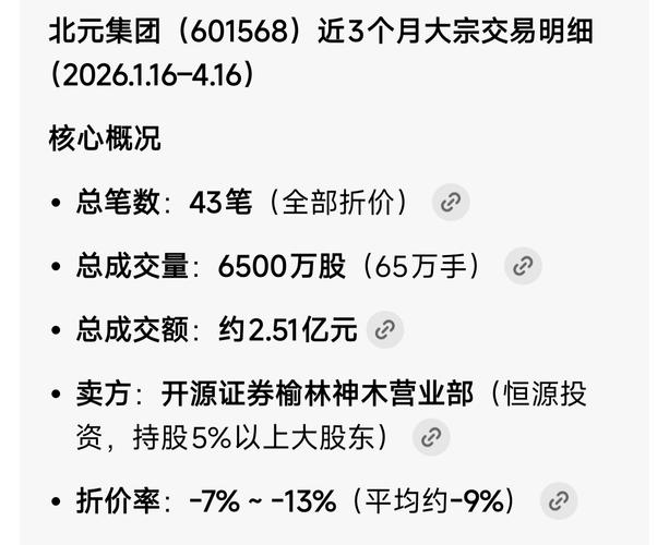 北元集团二股东:陕西恒源投资(第二大股东) 1、本轮减持总计划 计划减持:不超过7944.44万股(总股本2%) 2、已经减了多少(官方公告截至:2026.4.2) 已减持:3956.7万股(总股本1%) 减持价格区间:3.83~4.08元 已经完成:刚好一半(50%) 3、还剩多少没减完(核心答案) 剩余可减持数量: 7944.44万−3956.7万=3987.74万股 剩余比例:总股本还有1%...