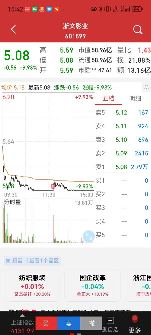 $浙文影业(SH601599)$快点跌下来我六毛五买一千股,六毛四挂一千五还没买到啊