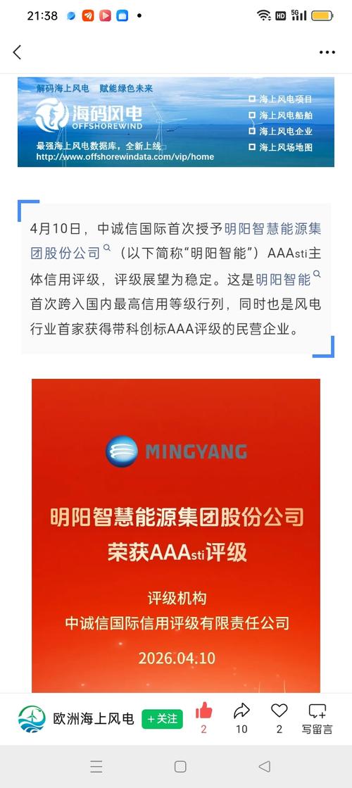 $明阳智能(SH601615)$中诚信国际首次授予明阳智慧能源集团股份公司(以下简称“明阳智能”)AAAsti主体信用评级,评级展望为稳定。这是明阳智能首次跨入国内最高信用等级行列,同时也是风电行业首家获得带科创标AAA评级的民营企业。