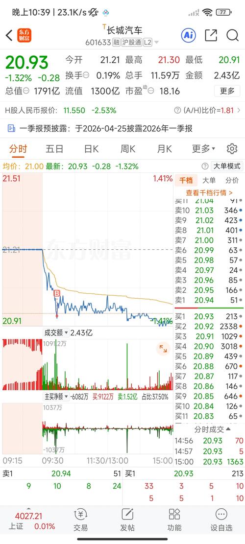$长城汽车(SH601633)$这盘子不大啊咋就没人拉呢? 我来对照你这张盘口截图,重新把数据确认一遍: 一、关键数据(以截图为准) •股价:20.93元 •总股本:85.58亿股 •总市值:1791亿元(=85.58×20.93) •流通股:62.09亿股(A股流通盘) •流通市值:1300亿元(=62.09×20.93) •自由流通股:10.94亿股(剔除大股东等锁定股份后的实际可交易A股) ...