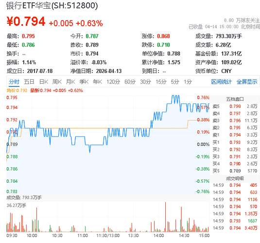 银行ETF华宝(512800)上涨0.63% 重庆银行领涨2.35% 净息差或于26年企稳回升 业绩弹性值得期待!