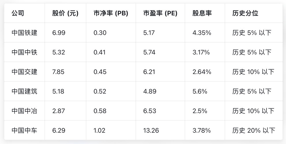 现在就是黄金坑!当AI泡沫破裂、题材股一地鸡毛,中铁、交建、铁建、中建、中冶、中车这六家核心央企资产正趴在历史最低估值区间,等待几百万价值投资者来捡钱!市净率0.3-1倍,市盈率5-13倍,股息率2.5-5.6%,手握10万亿+订单,背靠国家信用,这样的核心低位资产你敢不敢要? 一、市场正在犯致命错误:把钻石当石头卖 打开行情软件,你会看到触目惊心的数字: 这不是估值洼地,这是估值深渊!市场用脚投...