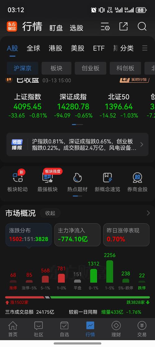 3月13日复盘:市场震荡调整,风电板块走强!
