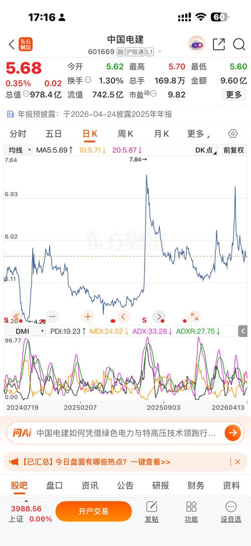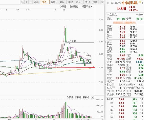 晚间话中国电建:今日回顾与明日展望 今日回顾 早盘5.62元开,最高冲至5.70元,最低下探5.60元,最终收盘5.68元,上涨0.35%,单日振幅1.77%,股价全天运行区间集中在5.60-5.70元。全天成交量169.8万手,成交额9.60亿,换手率1.30%,量比0.84,资金活跃度较前一交易日有所回落;委比-34.13%,卖盘力量稍占优势,内盘成交86.73万手,外盘成交83.05万手。个...