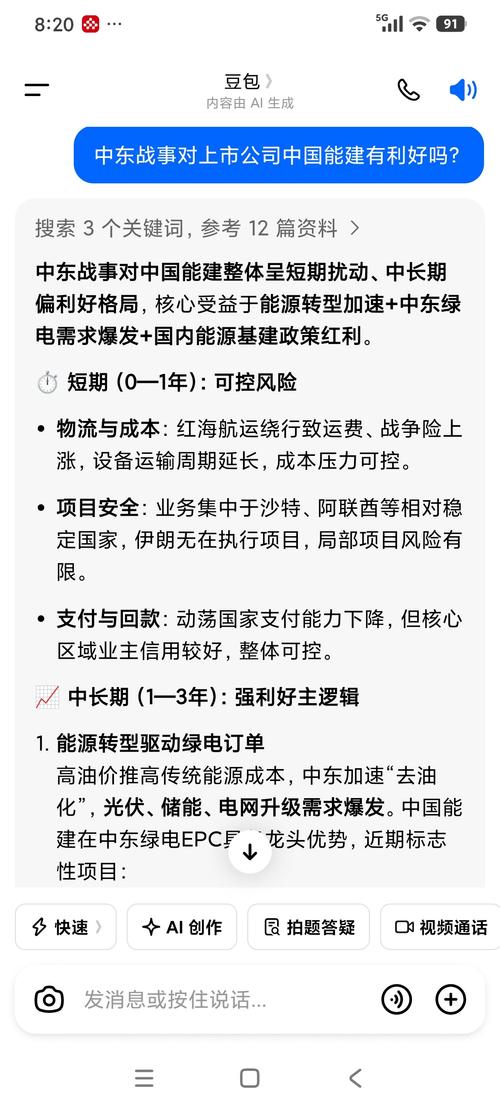 $中国电建(SH601669)$问豆包了,中东战争对电建长期利好,在伊朗没有项目,利空极小,海湾国家现在都在积极发展绿电,明天电建要涨停了