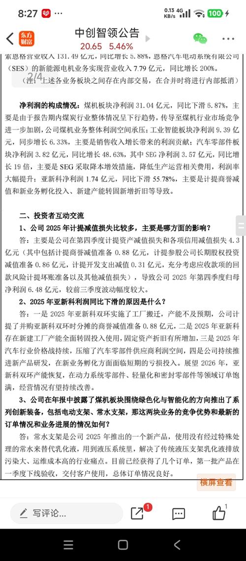 $中创智领(SH601717)$ 接访回答:煤机利润降6.87%,亚新科降一半,索恩格还在盈亏线挣扎。
