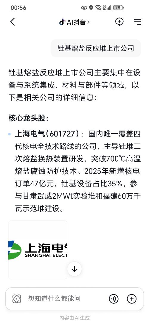 $上海电气(SH601727)$上海电气启动逻辑大概是,钍基熔盐堆最大的优点是不需要水冷,在干旱的内地都可以安全发电,可能会得以大范围推广,而电气又是设备供应技术的唯一龙头,这个市场前景可想而知。市值差不多是得以翻倍的存在。