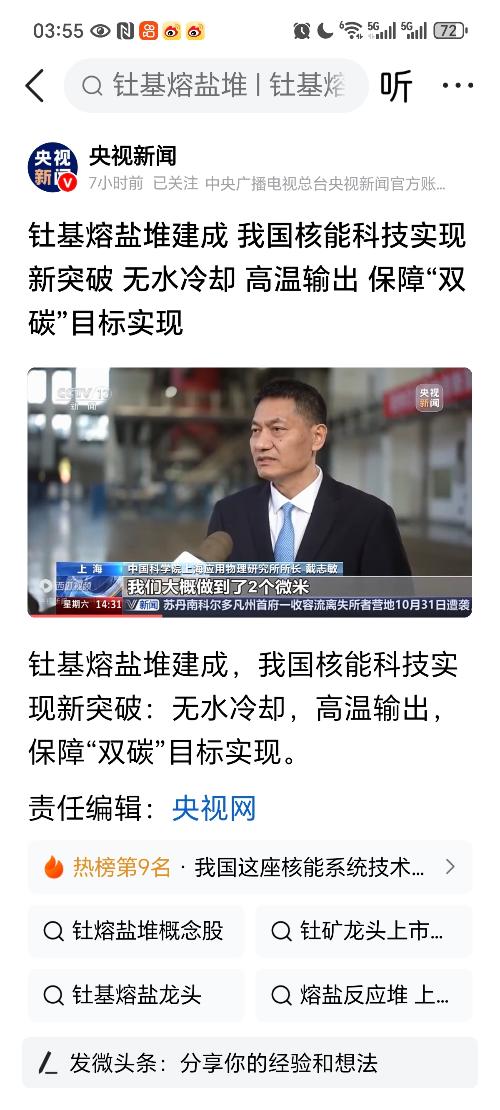 $上海电气(SH601727)$有点东西啊,钍基熔盐堆央视新闻播了两分钟。