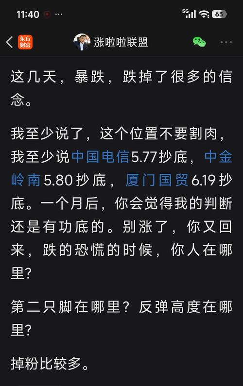 $厦门国贸(SH600755)$$中金岭南(SZ000060)$$中国电信(SH601728)$ 资金套在阿信,快一个月没做任何交易了。厦门国贸也无语。 如图所示,至于抄底价,我一般不轻易说,一旦说了,确定性还是很高的。 至于每只股的运行结构,实在是没心情说,等厦门国贸突破6.45,等中国电信突破5.77解套了,等中金岭南站稳20日线,有信心了再回来陪大家吧。