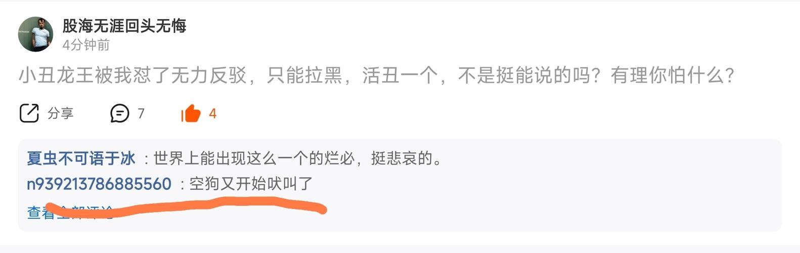 人不可以无耻,如果一个人不知道天地间有羞耻二字,那才是真的不知耻。人知耻,则能有所不为。五刑不如一耻。一个人无耻到无可救药的时候,围绕他的一切都会变得下作。 N93,一个对投资知识毫无认知的人却不知羞耻的卖弄自己的无知,无论怎么被客观事实打脸,依旧兽性使然,这是它个人的悲哀,也是它家庭的悲哀。回顾它在股吧里的所作所为,俨然一部小丑成长记,每一次的言语都毫无保留的暴露其可笑的认知和低下的人格,今日,...