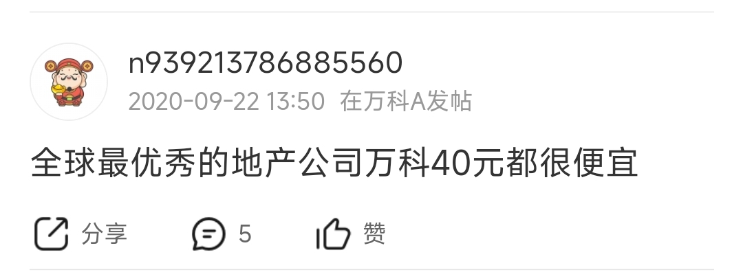小丑的伟大之处就是坚持不懈的丢人现眼。万科股价30元的时候无脑吹嘘一定会破40元!跌到20元的时候吹嘘一定会破30元!跌到十几元的时候吹嘘一定到20元!跌倒几块的时候吹嘘一定到10元。跌到新低的时候就吹嘘一定会翻倍!漫漫长路慢慢打脸,这么奇葩的行为不值得大家的掌声吗,哈哈哈哈哈!
