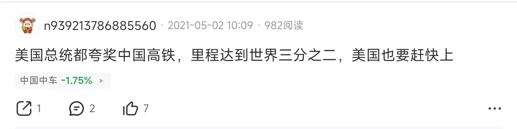 $中国中车(SH601766)$你们这群韭菜,要学会跟着大神炒股,看看这位大神,比99.7的投资者都有钱,比公司老总持股数量还多,每年都在一只股票赚40%以上,好好学去吧。
